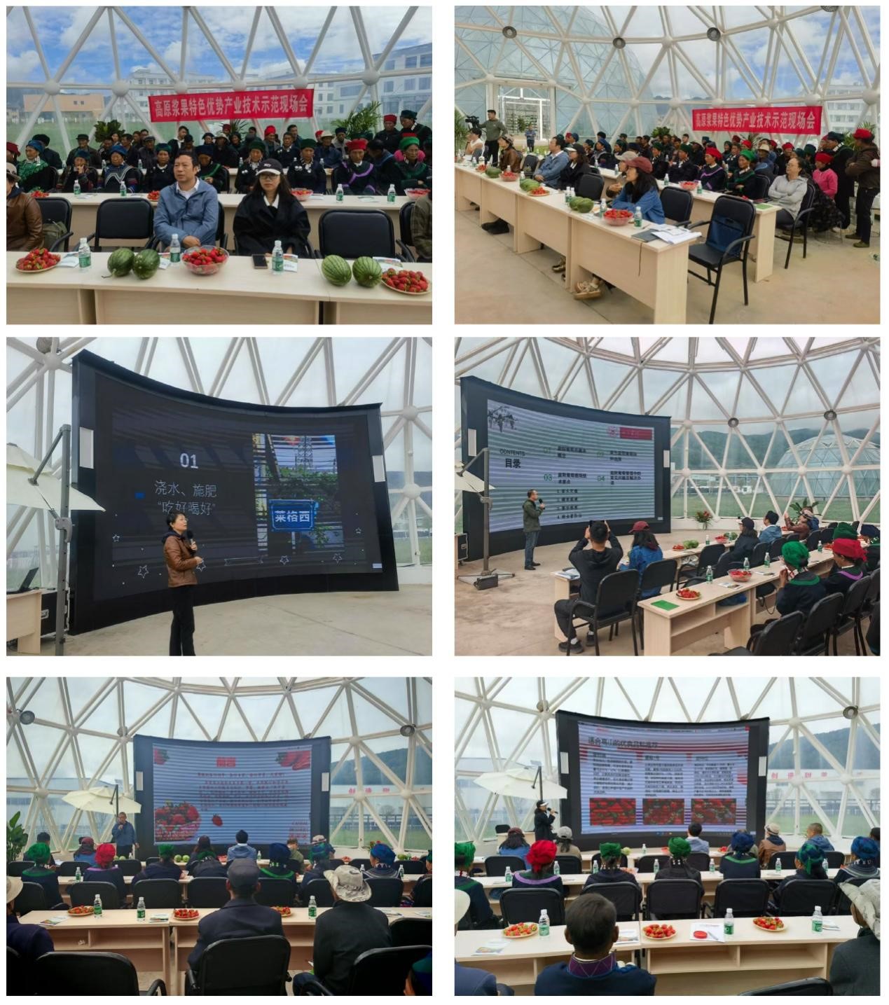 会议培训内容如下:董畅简要阐述了蓝莓"喜酸怕涝"的生长特性,讲授了调酸水制备方法及黑莓等庭院浆果关键栽培技术要点;覃杨系统阐释了庭院葡萄品种选择、整形修剪、水肥管理及病虫害防治等栽培关键技术;王云梅分析了高海拔地区种植草莓的优势,并就夏草莓品种选择、定植技术及病害防控等关键栽培技术进行讲解;申子日呷针对九如草莓生产加工工艺及相关产品展开详细介绍。