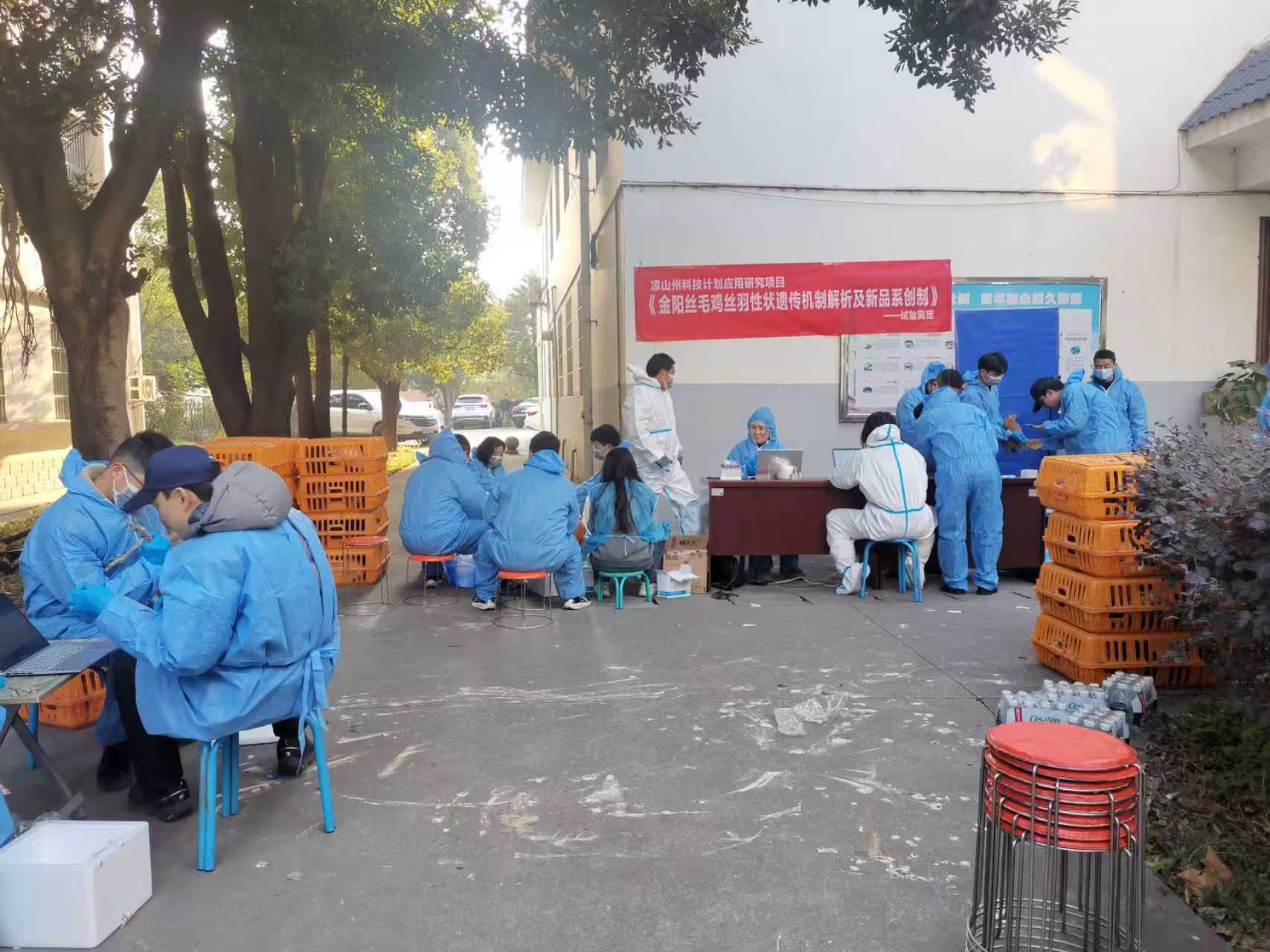 本次测定由凉山州农科院组织,全院畜牧兽医团队20余名专业技术人员参与表型数据测定、屠宰分割,四川农业大学黄安琪博士带领课题组4名硕士研究生全程参与技术操作与数据采集。项目组成员紧密配合,严格按照实验方案,系统测定了金阳丝毛鸡5月龄体重、体尺、屠宰率、全净膛率、胸腿肌发育及羽毛形态等35项关键指标,采集样本1000余份。下一步将基于基因组和转录组测序的联合分析,揭示丝羽性状形成的分子机制,为挖掘功能基因和分子育种奠定基础。